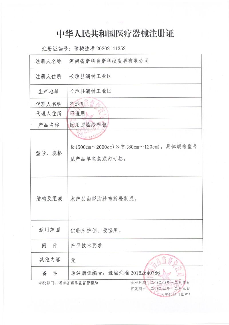 河南省斯科賽斯科技發(fā)展有限公司創(chuàng)建于 2011 年,位于“中國醫(yī)療耗材之都”- 河南省長垣縣,西臨 308 省道,南靠新菏鐵路,北依長濟高速,交通便捷,經(jīng)濟發(fā)達,環(huán)境優(yōu)美。斯科賽斯積極進入醫(yī)療健康和服務(wù)領(lǐng)域,秉承為用戶創(chuàng)造價值的理念,專注于醫(yī)用耗材解決方案的研發(fā)和運營,并為用戶提供完善的產(chǎn)品解決方案;  斯科賽斯主要生產(chǎn)醫(yī)用麻醉系列、醫(yī)用高分子系列、醫(yī)用敷料包系列、醫(yī)用無紡布系列、醫(yī)用防護系列、醫(yī)用脫脂棉系列、生物材料制品類等七大類、100 多個品種、400 多個規(guī)格的產(chǎn)品。公司占地面積約 30000 平方米,建筑面積20000 平方米,擁有 10 萬級的凈化車間總面積 10000 平方米。擁有國際先進水平的生產(chǎn)設(shè)備和檢測儀器,技術(shù)裝備精良,檢測手段完善,為醫(yī)療行業(yè)的不斷發(fā)展進步提供保障。公司順利通過 ISO9001、ISO13485 質(zhì)量管理體系認(rèn)證。  斯科賽斯堅持研發(fā)高科技新產(chǎn)品,力爭在醫(yī)療器械關(guān)鍵領(lǐng)域取得技術(shù)和研發(fā)的重大突破;立足國內(nèi)和國際兩個市場,逐步實現(xiàn)管理理念、經(jīng)營機制、人力資源、技術(shù)、產(chǎn)品、市場等全方位對接,提高企業(yè)的核心競爭力;過去的歲月里,斯科賽斯砥礪前行,誠信務(wù)實,銳意進取,不斷創(chuàng)新,用自己的睿智和辛勞,以富有責(zé)任感的使命,在探索中追求,在追求中超越,致力于成為值得信賴的醫(yī)療用品生產(chǎn)企業(yè)!在未來的日子里,斯科賽斯將一如既往豪情滿懷,信心百倍,攜手并肩,執(zhí)著追求,向更高的的目標(biāo)前進,鑄造新的輝煌!